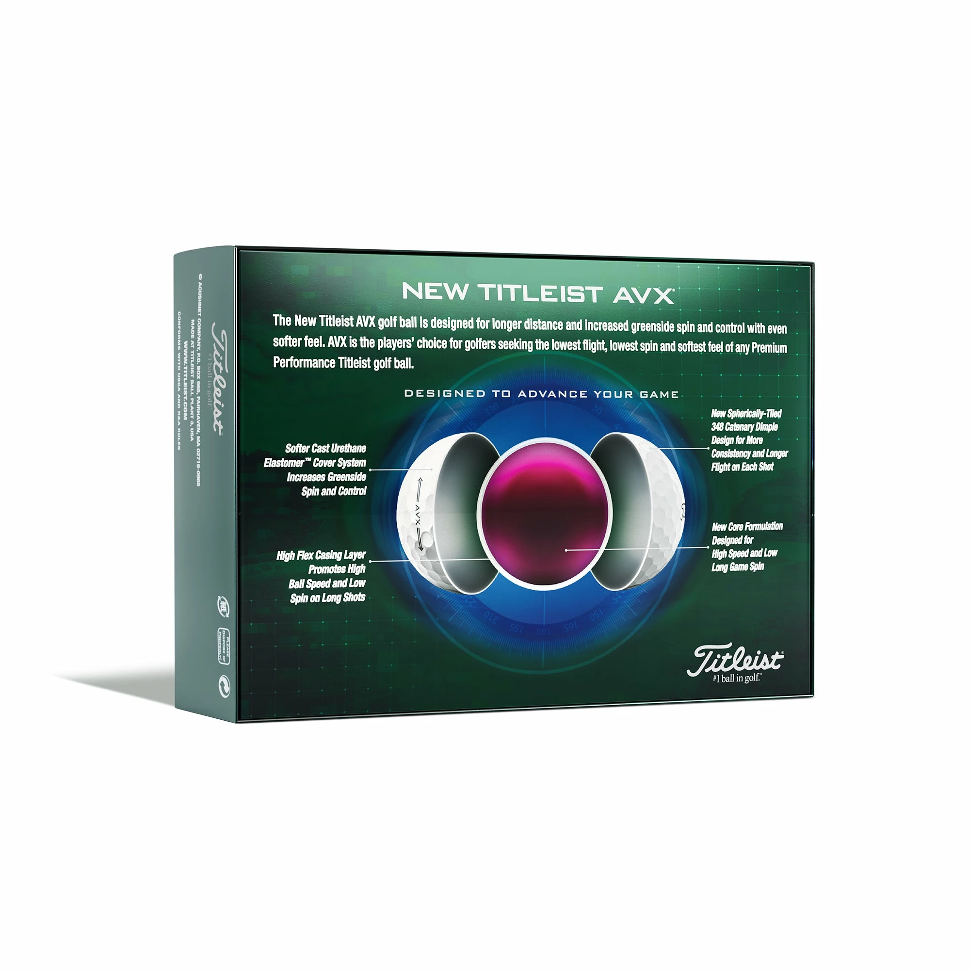 Titleist AVX Golf Balls – White Dozen. The new Titleist AVX golf balls are for golfers looking to level up their game with advanced technology that delivers low flight, low iron spin for noticeably longer distance, incredibly soft feel and now, even more control.
